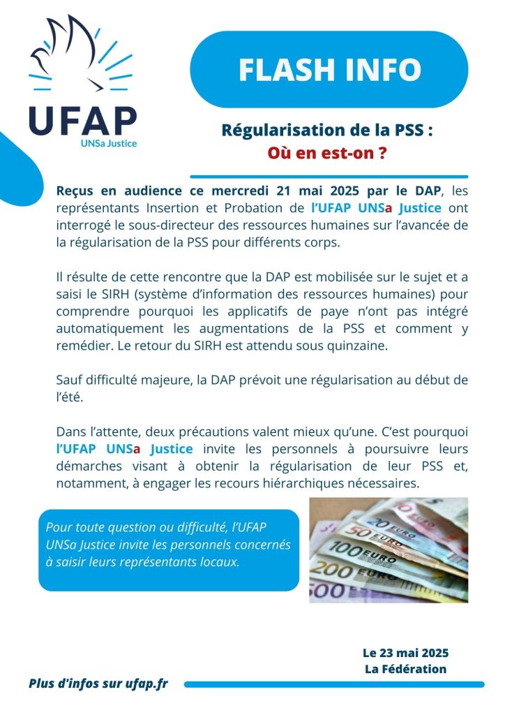Dans l’attente, deux précautions valent mieux qu’une. C’est pourquoi l’UFAP UNSa Justice invite les personnels à poursuivre leurs démarches visant à obtenir la régularisation de leur PSS et, notamment, à engager les recours hiérarchiques nécessaires.