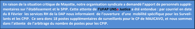 Si la DAP semble sensible à notre argumentation en répondant favorablement à nos interventions, ll’UFAP UNSa Justice reste cependant très attentive aux actions menées et attend avec impatience les prochains retours. Affaires à suivre donc…