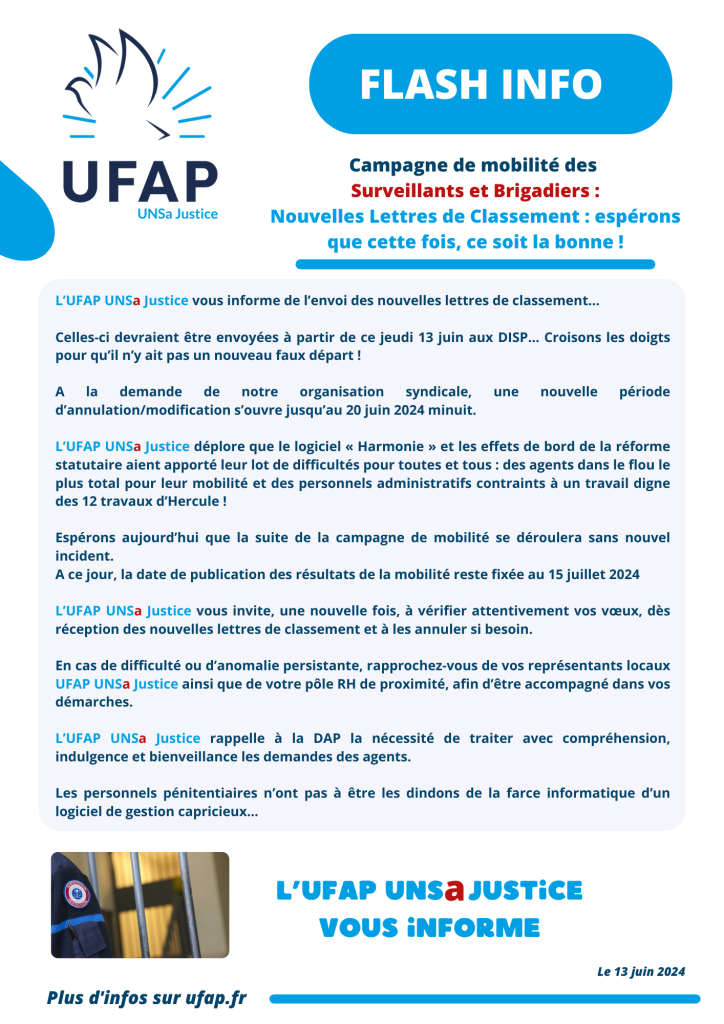 L’UFAP UNSa Justice vous informe de l’envoi des nouvelles lettres de classement…