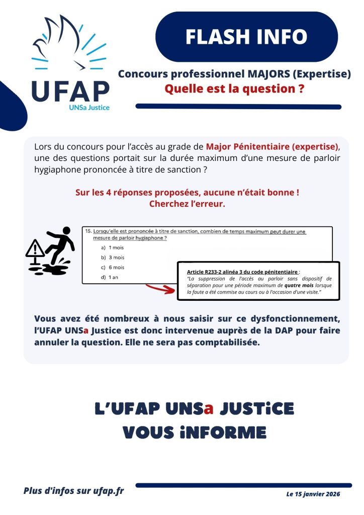 Vous avez été nombreux à nous saisir sur ce dysfonctionnement, l’UFAP UNSaJustice est donc intervenue auprès de la DAP pour faire annuler la question. Elle ne sera pas comptabilisée.
