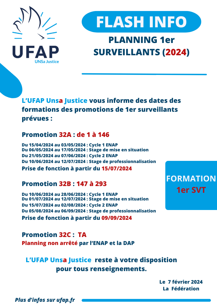 L’UFAP Unsa Justice vous informe des dates des formations des promotions de 1er surveillants prévues :