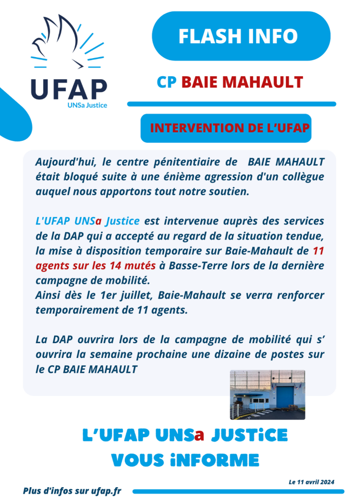L’UFAP UNSa Justice est intervenue auprès des services de la DAP qui a accepté au regard de la situation tendue, la mise à disposition temporaire sur Baie-Mahault de 11 agents sur les 14 mutés à Basse-Terre lors de la dernière campagne de mobilité.