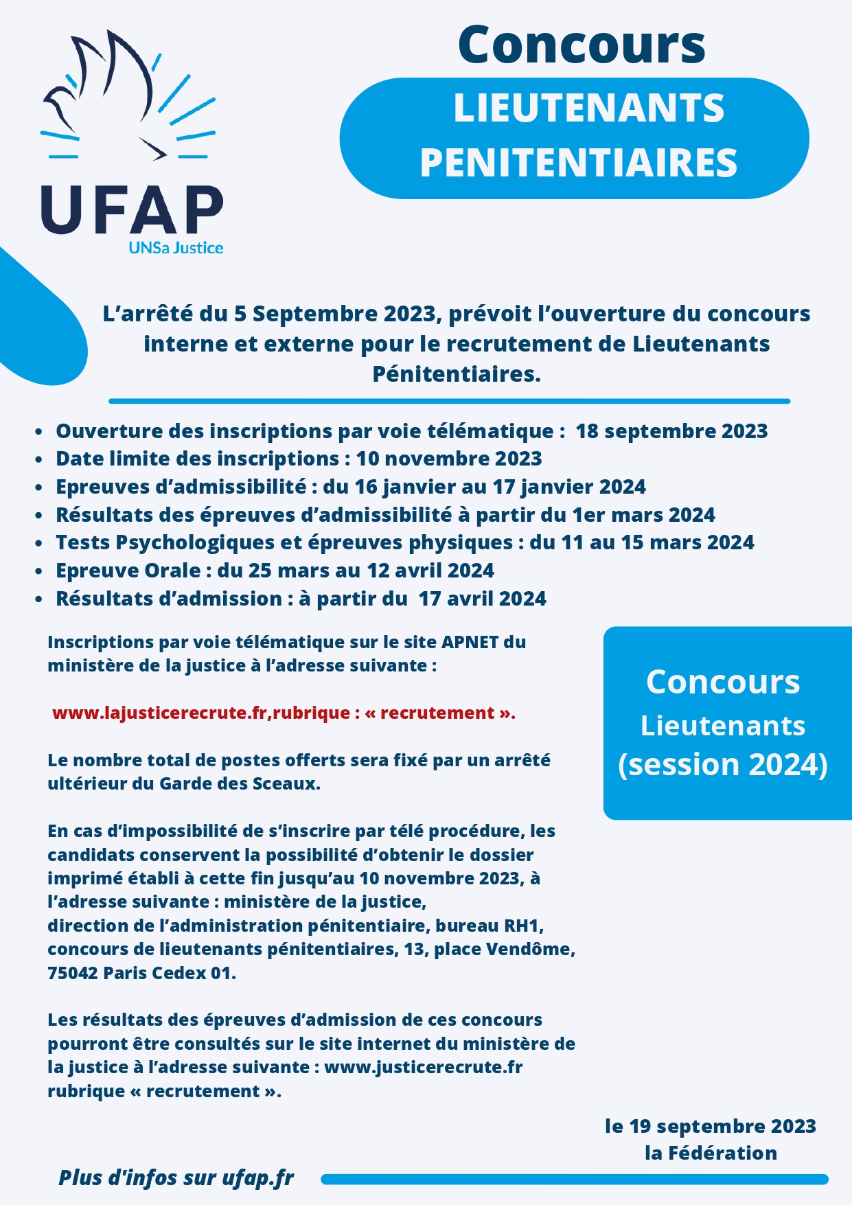 L’arrêté du 5 Septembre 2023, prévoit l’ouverture du concours interne et externe pour le recrutement de Lieutenants Pénitentiaires.