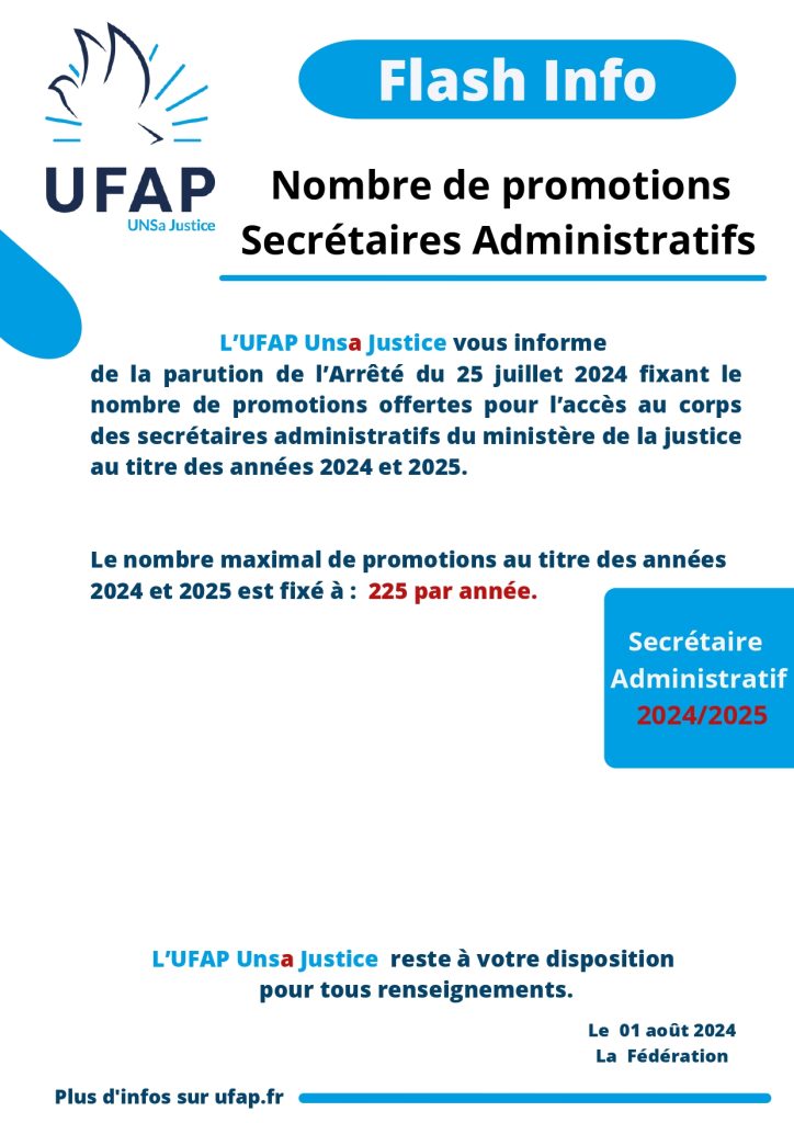 Flash info concernant le nombre de promotions offertes pour l’accès au corps des secrétaires administratifs du ministère de la justice au titre des années 2024 et 2025.