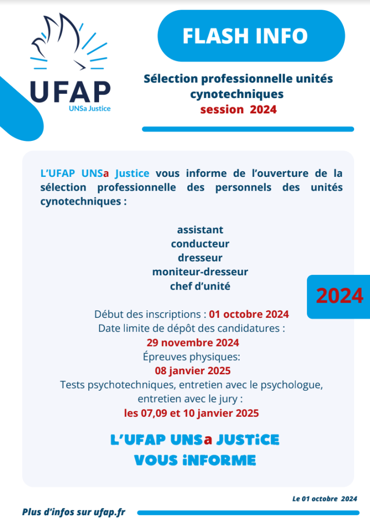 L’UFAP UNSa Justice vous informe de l’ouverture de la sélection professionnelle des personnels des unités cynotechniques :