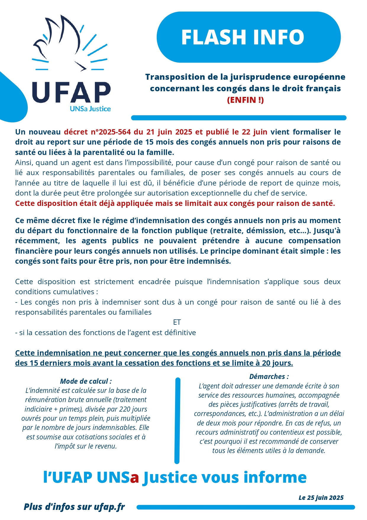 Un nouveau décret n°2025-564 du 21 juin 2025 et publié le 22 juin vient formaliser le droit au report sur une période de 15 mois des congés annuels non pris pour raisons de santé ou liées à la parentalité ou la famille.