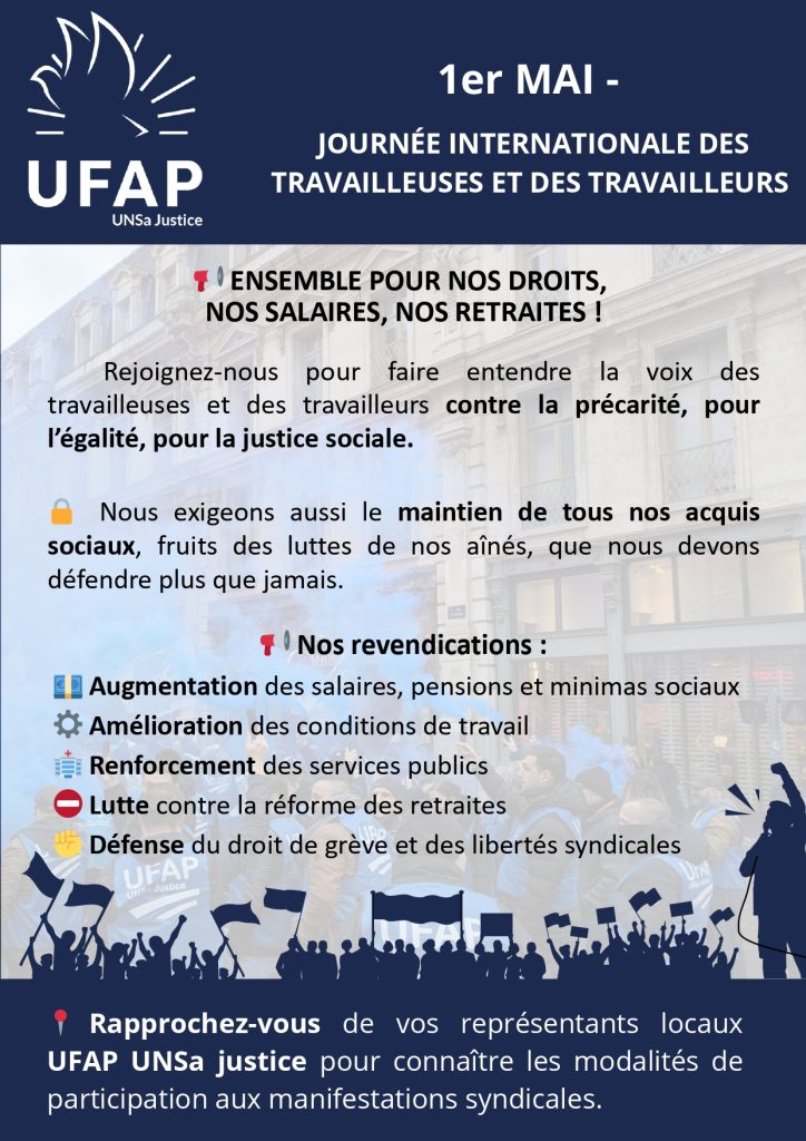Rapprochez-vous de vos représentants locaux UFAP UNSa justice pour connaître les modalités de participation aux manifestations syndicales.