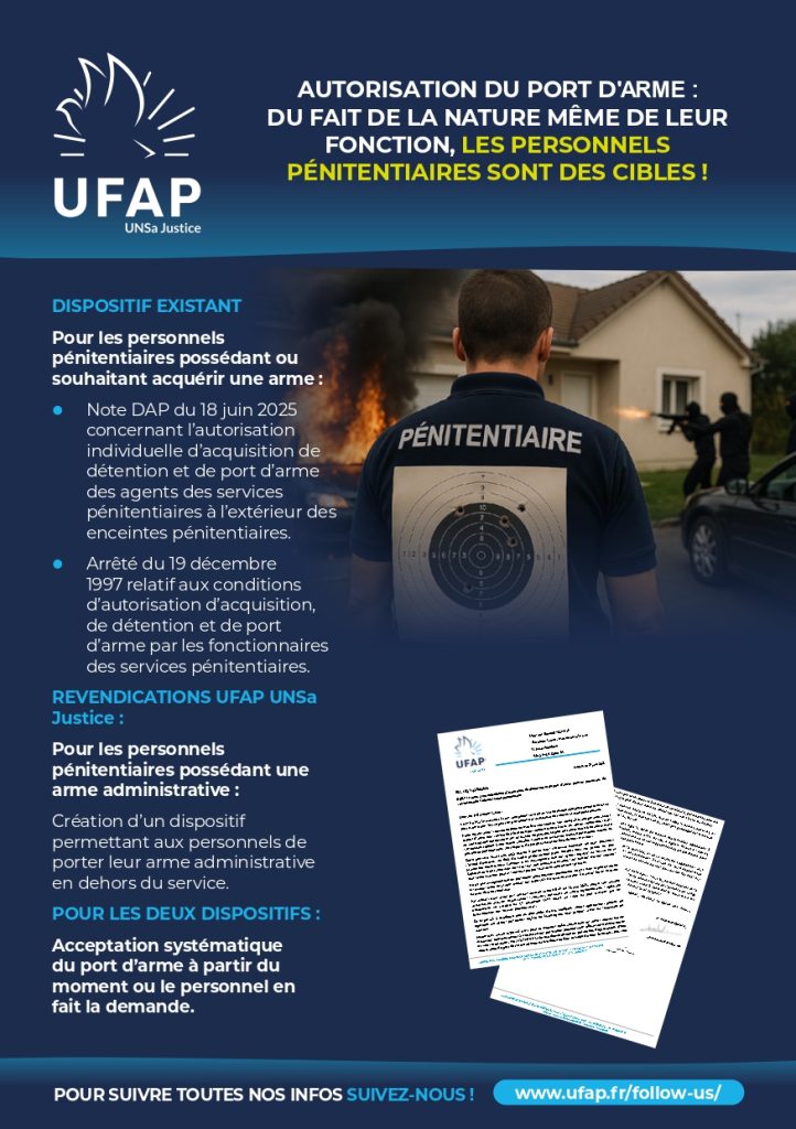 - Note DAP du 18 juin 2025 concernant l’autorisation individuelle d’acquisition de détention et de port d’arme des agents des services pénitentiaires à l’extérieur des enceintes pénitentiaires.