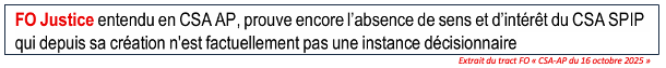 Notre organisation continuera à défendre les sujets métiers aussi bien en CSA SPIP qu’en CSA AP, considérant que donner la parole aux personnels des SPIP dans une instance propre est la moindre des reconnaissances pour les spécificités de leurs métiers !
