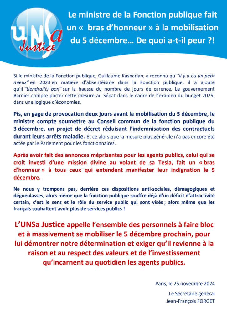 Communiqué mobilisation du 5 décembre et bras d’honneur de Kasbarian