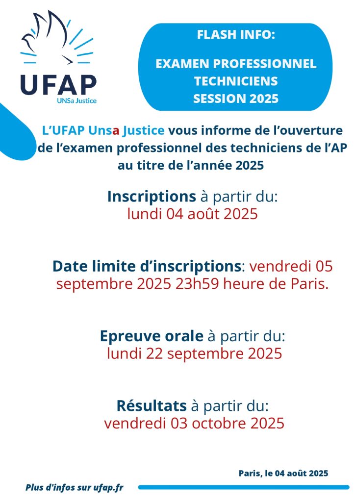 L’UFAP Unsa Justice vous informe de l’ouverture de l’examen professionnel des techniciens de l’AP au titre de l’année 2025