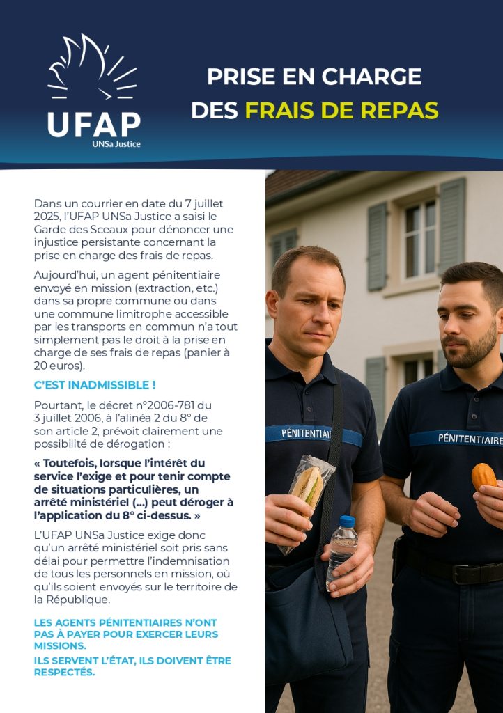 Dans un courrier en date du 7 juillet 2025, l’UFAP UNSa Justice a saisi le Garde des Sceaux pour dénoncer une injustice persistante concernant la prise en charge des frais de repas.