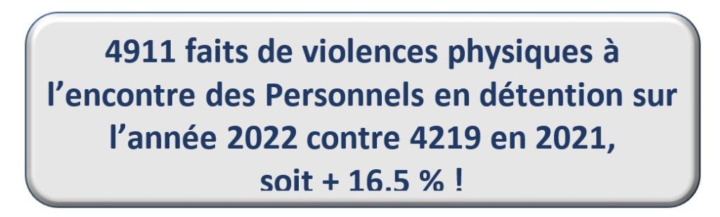 Pendant que la déontologie s’illumine telle une belle vitrine politique à contempler, les collègues se font agresser et sont à bout psychologiquement ! Pour rappel, déjà en crise d’effectif comme jamais, les personnels sursollicités subissent aussi l’entassement avec 75000 détenus pour moins de 61000 places opérationnelles et sont, de ce fait, les victimes des violences que cela engendre.