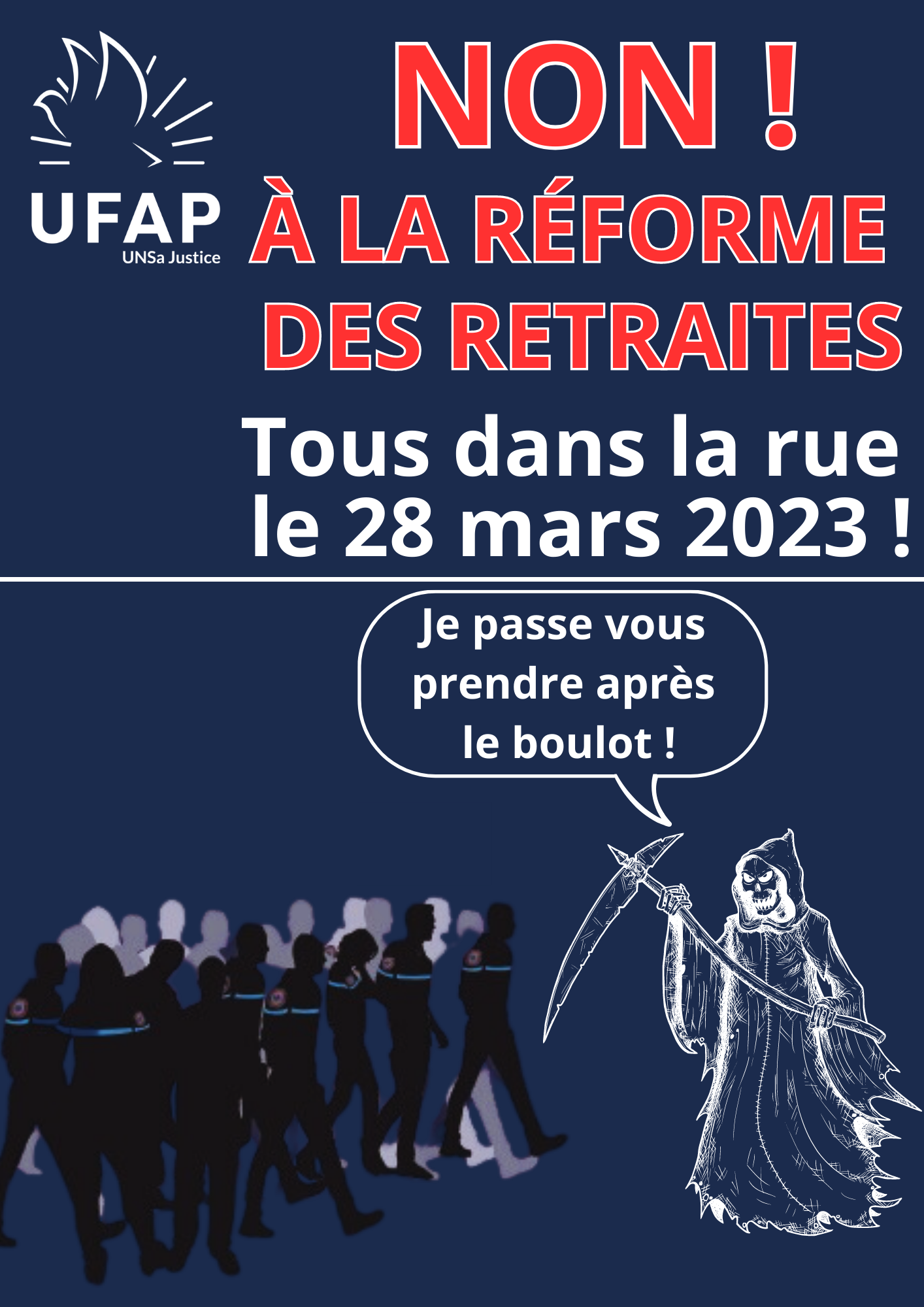 L’UFAP UNSa Justice appelle tous les Personnels pénitentiaires, dans le respect des obligations statutaires qui sont les leurs, à se mobiliser massivement et avec détermination le mardi 28 mars prochain et à participer aux rassemblements et cortèges organisés à Paris, en Province et en Outre-Mer.