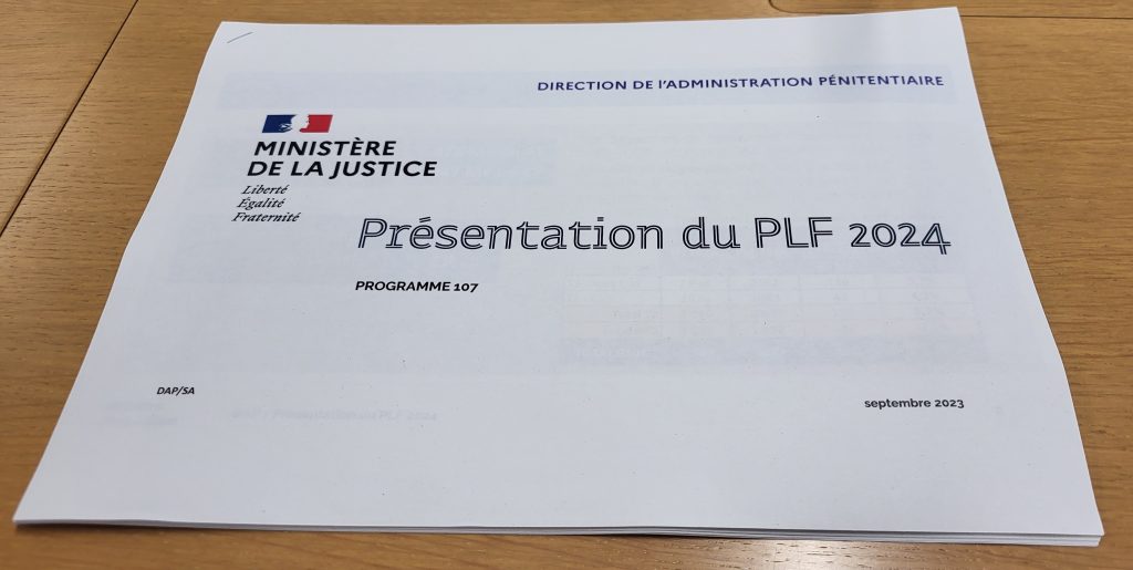 Cet après -midi à la DAP, se tenait la présentation du Projet de Loi de Finances (PLF) 2024 pour notre administration. Le budget de l’administration pénitentiaire en 2024 se monte à 3,9 milliards donc sans augmentation par rapport à l’année précédente, alors qu’il augmente dans les autres directions et au secrétariat général. Les mesures catégorielles […]