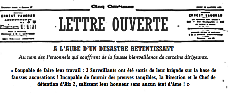 A L’AUBE D’UN DESASTRE RETENTISSANT Au nom des Personnels qui souffrent de la fausse bienveillance de certains dirigeants. « Coupable de faire leur travail : 3 Surveillants ont été sortis de leur brigade sur la base de fausses accusations ! Incapable de fournir des preuves tangibles, la Direction et le Chef de détention d’Aix 2, […]