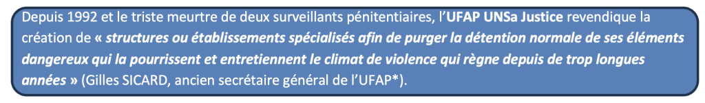 La mise en place généralisée d’établissements pénitentiaires spécialisés et adaptés doit permettre d’y affecter les détenus en fonction exclusivement de leur dangerosité (profils pénaux et carcéraux). Il faut avant tout une évolution législative pour permettre cette mise en place. Puis, l’architecture, la sécurité et les moyens humains et matériels permettront, quant à eux, une prise en charge en adéquation avec les besoins sécuritaires tant des personnels que de la société.